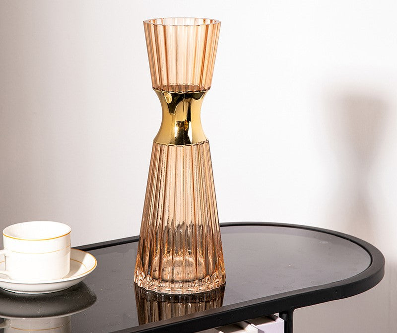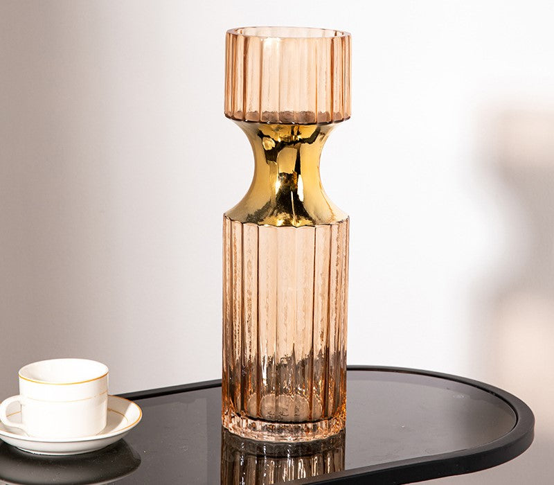 This elegant and luxurious glass vase has a translucent surface with scalloped textures and a subtle amber tint, perfect for decorating any home with style. The scalloped textures provide the vase's surface with shapes of low-raised desert dunes, connecting the form of the vase to nature and enhancing the natural elements in the vase. It serves as a decorative vase that allows for a stunning display of flowers on tabletops, mantles, or corner tables. Made of high-quality glass with a glossy surface, this flower vase is both durable and visually appealing. The amber glass vase decor accent has a versatile shape that allows for easy placement and seamlessly complements any home decor theme.